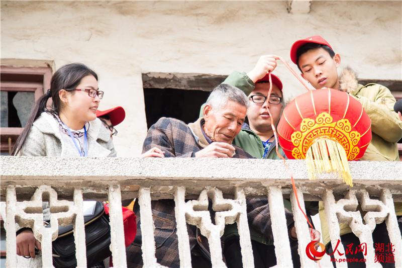 图为同学们为村民挂上喜庆的红灯笼 摄影:李鳌