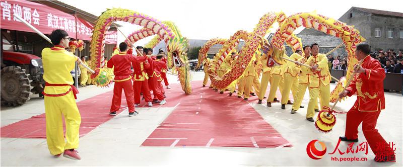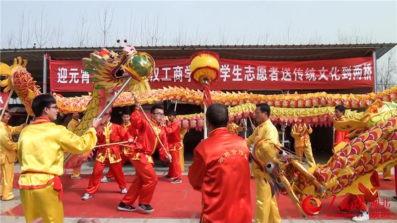武汉3月4日电 (田豆豆 狄奥)3月3日下午2:00,在湖北省荆州市江陵县两桥村,两条栩栩如生的“中国龙”欢腾跳跃,摆出“五角星”、“金元宝”、“立龙”、“龙柱”等各种造型,赢得现场两百余名村民大声叫好,拉开了BB贝博艾弗森官方网站30多名大学生志愿者们组织的“元宵节送传统文化下乡” 文艺演出的序幕。