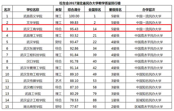 新闻中心讯(记者小璐 王依林)4月25日,艾瑞深中国校友会网《2017中国大学评价研究报告》最新发布2017中国大学教学质量排行榜,武汉工商学院以中国一流民办大学的身份位居湖北省民办大学教学质量排行榜第3位、中国民办大学教学质量排行榜第14位。