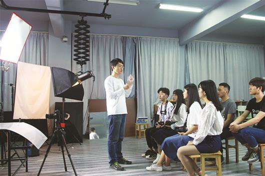 图为老师为学生指导摄影技巧