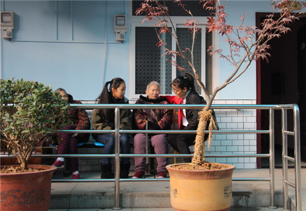 学生志愿者正在陪老人聊天 摄影赖鹏