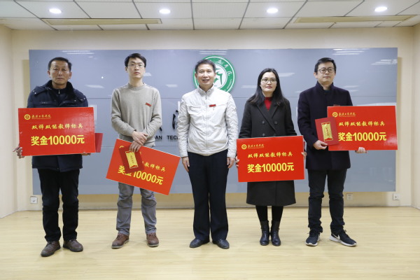 图为陈奎生校长(中)为“双师双能教师标兵”获奖者颁奖 摄影:孙欢欢