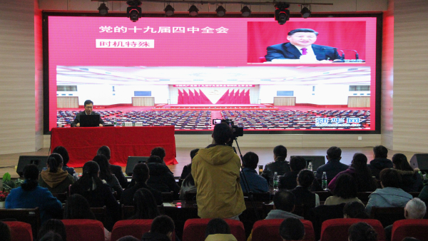 刘爱国副部长以“完善制度体系 发挥治理效能 为实现中华民族伟大复兴和国家社会长治久安努力奋斗”为主题,从“深刻认识党的十九届四中全会召开的重大意义”“深刻领会中国特色社会主义制度和国家治理体系的显著优势,坚定制度自信”“准确把握坚持和完善中国特色社会主义制度、推进国家治理体系和治理能力现代化的总体要求、总体目标和重点任务”“全面加强党的领导,确保全会确定的各项目标任务落实到位”等四个方面对十九届四中全会精神进行了全面、深入、透彻的解读,并强调,广大师生党员要坚定制度自信,深刻认识到“中国之治”的伟大成就。