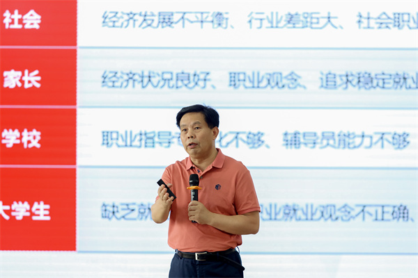 赵北平副校长从高校大学生就业现状出发,分析了大学生就业意愿较弱、就业能力较差的原因,提出大学生就业需要培养就业主体意识、雇主意识,在认识到就业重要性的同时,树立正确的就业观念,了解企业运转逻辑,清楚企业价值与创造。他还向大家列举了立讯精密董事长王来春的例子:出身农村的她曾是富士康公司的一个普通小工人,每天干着重复机械的工作,但她的人生没有止步于此,凭借着惊人的主体意识和敏锐的商业嗅觉,她从流水线离职,创办自己的公司,最终变身成身价百亿的董事长。