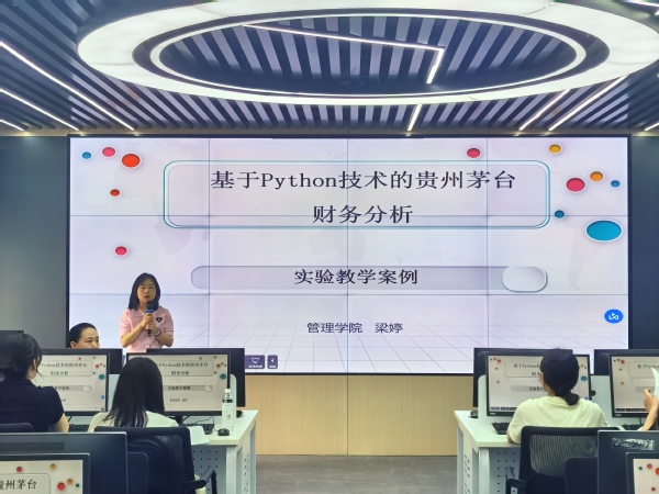 管理学院副教授梁婷作为公开课的主讲人,以《基于Python技术的贵州茅台财务分析实验教学案例》为主题,结合自身多年教研工作经验和专业知识,向大家讲解了Python语言在机器学习和数据分析中的实际运用,分享了实现财务大数据预测、挖掘、统计、分析与应用的方法和基本思路。她希望借此机会帮助大家理解大数据时代下财务分析技术的变化,进一步掌握数据处理和分析技术,培养具有数据处理和分析能力的复合型、应用型财务人才。