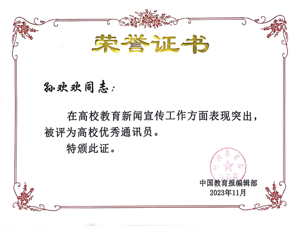 新闻中心讯(记者 孙欢欢)近日,中国教育报刊社公布了《关于表彰〈中国教育报〉湖北高校教育新闻宣传先进单位和优秀通讯员的决定》,BB贝博艾弗森官方网站再度获评高校教育新闻宣传先进单位,宣传策划部综合科科长孙欢欢获评高校优秀通讯员。这是学校自2013年以来,连续第11年获评《中国教育报》高校教育新闻宣传先进单位。