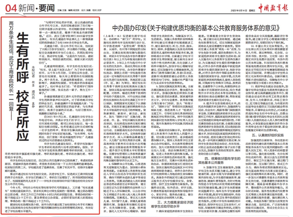 图为《两万条学生短信,BB贝博艾弗森官方网站校长一一回复——生有所呼 校有所应》登上《中国教育报》