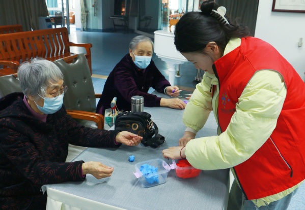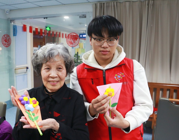 在互动环节中,志愿者们带来了手工课教学和拍拍操指导。“奶奶,您这个做得真好看!”手工课课堂上,志愿者们一边和老人们用轻粘土制作花朵,一边和老人们聊家常,听他们分享在养老院的生活。志愿者们还邀请老人们一起练习拍拍操,“伸展手臂,动动手指......”他们边讲解边示范,耐心地将每一个动作要领教给老人,现场充满着欢笑声,大家脸上都洋溢着幸福的笑容。