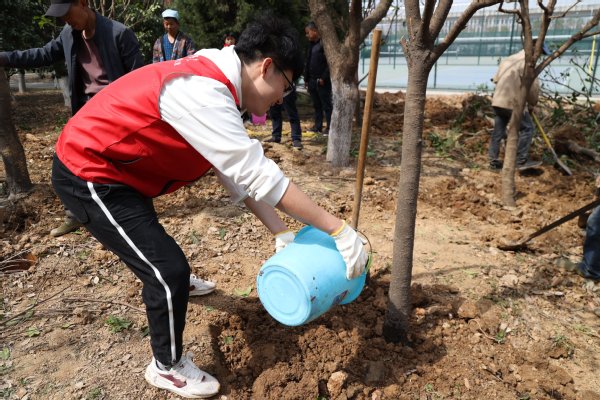 在植树现场,校领导与广大师生一起挥锹铲土、培土围堰、扶苗浇水,合力栽下新苗。大家干劲十足,配合默契,现场一片忙碌的劳动景象。学校“青年马克思主义者培养工程”培训班的同学们在专业种植人员的指导下,相互协作,有的翻土、有的浇水、有的扶正树苗,各个环节衔接有序,在大家的齐心协力下,一棵棵新栽好的树苗迎风而立,在和煦的春光中展现出蓬勃生机。