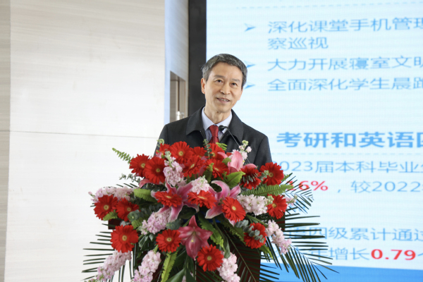 他指出,2023年,学校获批国家级一流本科课程1门,累计获批国家级一流本科课程5门,数量居全国同类高校前列;上线国家主流线上教学平台在线课程2门;获批教育部产学合作协同育人项目4项;获批国家自科基金项目1项、国家社科基金项目1项、教育部重大课题攻关项目子课题项目1项;学校品牌影响力取得跨越性提升,连续3年雄踞校友会中国工商类民办大学榜首。他强调,这些成绩的取得,得益于董事会、校务会、党委会的正确领导和果敢决策,得益于全体领导干部戮力同心、担当作为,更得益于全校师生辛勤耕耘、不懈奋斗。