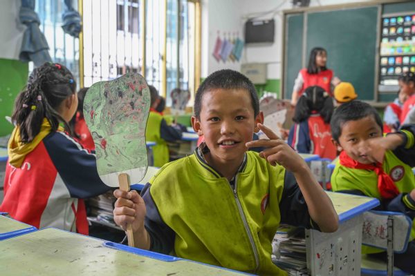 图为孩子们开心地展示自己制作的漆扇和绘画作品 摄影:李若源