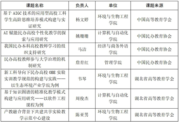 新闻中心讯(特约记者 张黎力)近日,中国高等教育学会、中国民办教育协会及湖北省高等教育学会公布了2024年课题立项名单,我校有7位教师申报的课题获批立项,其中中国高等教育学会课题获批1项,中国民办教育协会课题获批3项,湖北省高等教育学会课题获批3项。具体名单如下: