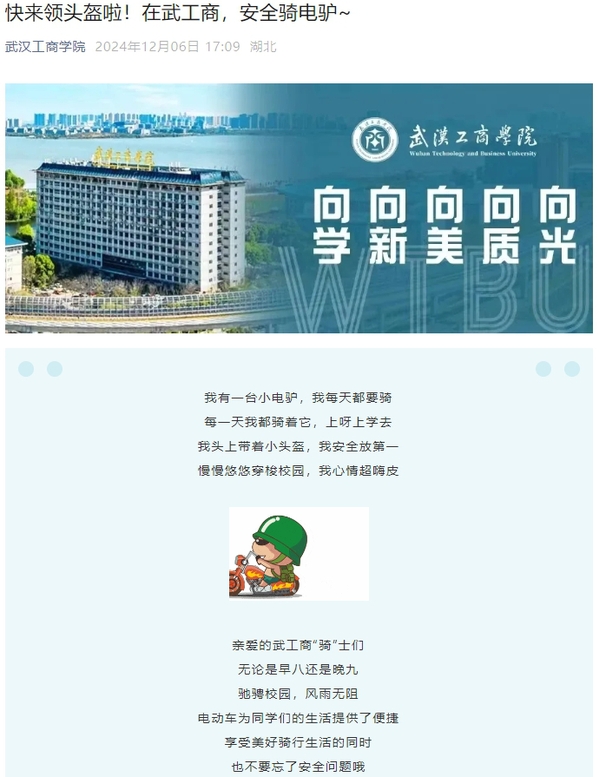微信推文《快来领头盔啦!在武工商,安全骑电驴~》