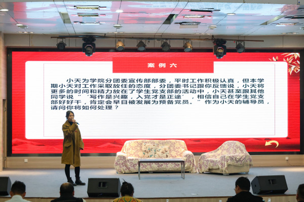 在比赛中,来自各二级学院的10位辅导员们思路清晰、逻辑缜密、分析合理、处理得当,表现出了优良的政治素质、理论水平、专业素养和职业能力:肖隽老师在面对学生毕业实习碰壁案例时,思路清晰,从多方面分析这个学生所遇到的难题,既分析了外部环境,又分析了学生自身的问题所在,深入浅出,为学生提供了切实可行的帮扶方案;龙黎明老师在处理学生问题时注重循序渐进和加强对学生教育的引导,尤其在面对学生情绪波动较大的问题时,特别提出了要关注该学生的社交媒体,随时关注其思想动态,只有了解学生真实面临的问题,帮助学生厘清问题所在,才能有效掌握处理问题的主动权;程琬涵老师在谈心谈话环节遇到了一位遭到孤立的学生的家长,这位“家长”一上来便气势汹汹向老师问责,后面更是对老师“百般刁难”,这无疑给辅导员老师的疏导工作增加了难度,但程琬涵老师的表现可圈可点,首先安抚了家长的情绪再对问题进行处理,整个过程,随机应变且十分有耐心,展现了她敏锐的问题分析能力、灵活的沟通技巧和良好的心理素质……