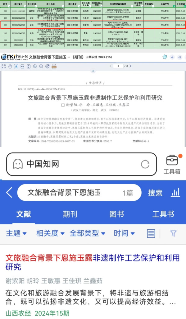 同时,进行项目汇报或活动宣传时,往往需要进行公众演讲或公开展示,这也提升了我的表达能力和自信心。2024年,我参与了大学生创新创业计划项目,作为队长,我需要作为代表进行最后答辩。最初,面对台下众多专业人士,我紧张得声音发颤,但经过一次次的模拟演练和自我突破,我逐渐掌握了演讲技巧,能够清晰、生动地阐述项目的商业模式、市场前景与竞争优势。最后,凭借出色的展示,我们的项目获得了台下评委们的青睐。我带领团队发表的“文旅融合背景下恩施玉露非遗制作工艺保护和利用研究”论文被省级期刊《山西农经》收录。