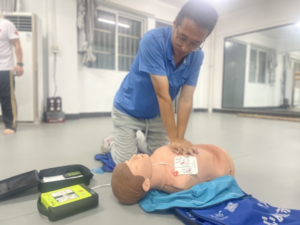 新闻中心讯(特约记者 邢扬埼)5月22日下午,中国红十字会救护师、武汉长江救援志愿队常务副秘书长袁国华,汉阳区红十字救护项目负责人彭玉两位资深培训师,不顾暴雨来到BB贝博艾弗森官方网站体育运动中心,为学校公共课部大学体育教研室的21名体育教师带来了一场“心肺复苏(CPR)+AED操作”应急救护专题培训。