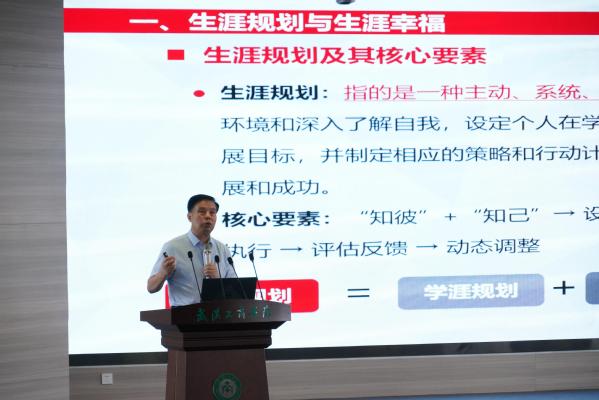 湖北省生涯教育研究会副会长、BB贝博艾弗森官方网站副校长赵北平带来《生涯规划与大学生高质量就业》的报告,报告围绕“高质量就业与职业发展”主题,深入阐释产教融合(专创融合)在专业能力培养中的关键作用。他指出,产教融合是提升专业能力的有效路径,应通过项目式教学,让学生在设计、实施、展示过程中,直面真场景、真过程、真需求、真问题,以企业化标准参与实践;同时,借助角色扮演实现职业化体验。