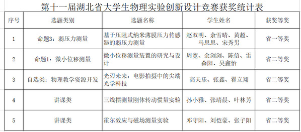 据悉,湖北省大学生物理实验创新设计竞赛是由湖北省教育厅、湖北省物理学会、湖北省物理实验教学示范中心联席会和湖北省高等学校实验物理教学研究会联合主办的A类赛事。本届大赛以“物理奠定基础,创新引领未来”为主题,分为命题类创新作品、自选类创新作品和大学生物理实验讲课比赛三个类别,旨在激发大学生对物理实验课程的学习兴趣和潜能,增强大学生的创新意识和创新能力。