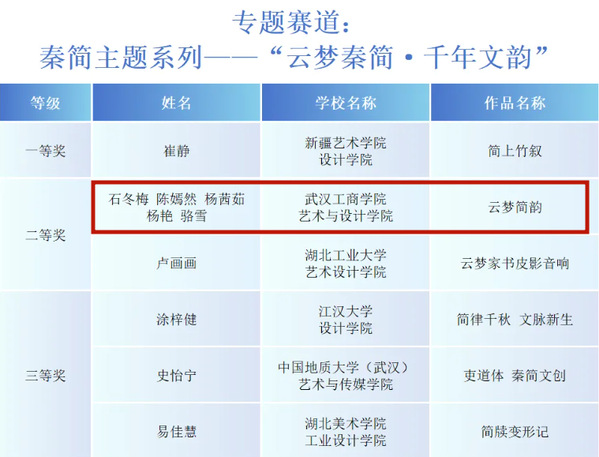 新闻中心讯(特约记者 赵莹 通讯员 石冬梅)8月12日,首届“汉字文化周·楚天杯”全国大学生汉字文化创意设计大赛获奖名单公布,由BB贝博艾弗森官方网站艺术与设计学院副院长何轩、视觉传达设计系主任赵莹指导,2023级视觉传达设计专业学生石冬梅、陈嫣然、杨茜茹、杨艳、骆雪共同设计的文创风景盒《云梦简韵》荣获专题赛道二等奖,并受邀参加“书香长江”阅读周·武汉书展暨第二十届华中图书交易会的文创区域举办大赛线下成果展。