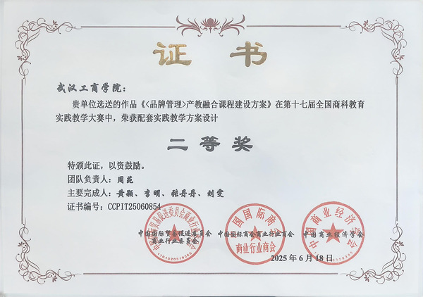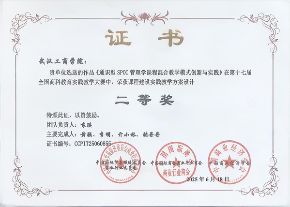 此外,由应用技术学院教师熊晓亮、彭文杰、徐亚玲、杨晶、周强共同完成的作品《产教融合模式下工作室制实践育人创新研究》荣获教学案例类二等奖;由管理学院教师袁瑛、黄颖、李明、亓小林、张丹丹共同完成的作品《通识型SPOC管理学课程混合教学模式创新与实践》荣获课程建设实践教学方案设计二等奖;由管理学院教师周苑、黄颖、李明、张丹丹、刘雯共同完成的作品《<品牌管理>产教融合课程建设方案》荣获配套实践教学方案设计类二等奖。