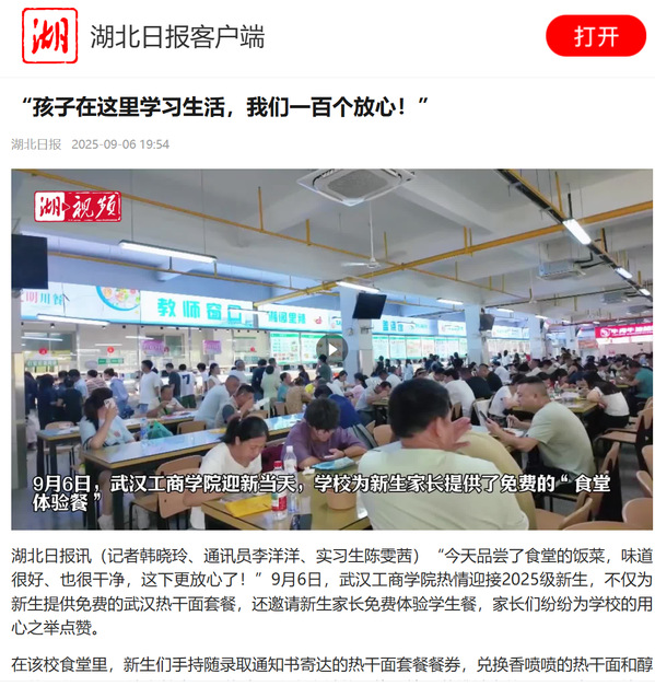 湖北日报讯(记者韩晓玲、通讯员李洋洋、实习生陈雯茜)“今天品尝了食堂的饭菜,味道很好、也很干净,这下更放心了!”9月6日,BB贝博艾弗森官方网站热情迎接2025级新生,不仅为新生提供免费的武汉热干面套餐,还邀请新生家长免费体验学生餐,家长们纷纷为学校的用心之举点赞。