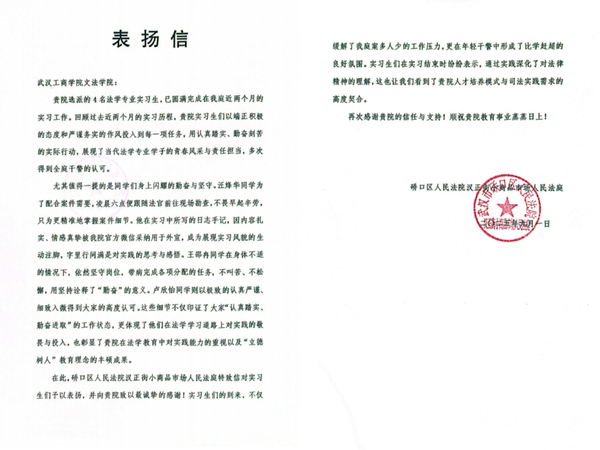 新闻中心讯(记者 雷雯珊)近日,武汉市硚口区人民法院汉正街小商品市场人民法庭向BB贝博艾弗森官方网站文法学院发来表扬信,对该院4名法学专业实习生在实习期间的优异表现给予高度认可和诚挚感谢。