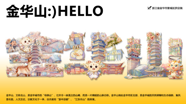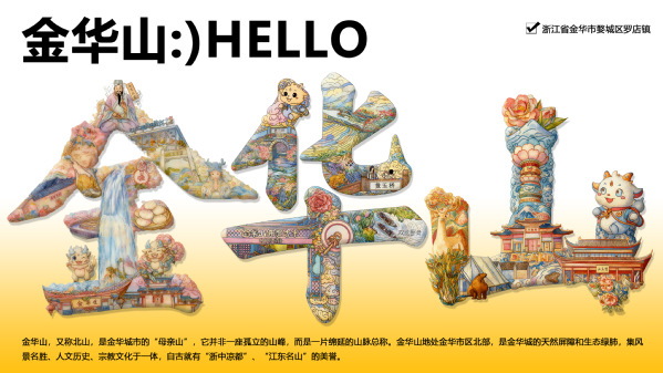 创作者沙琬淇介绍,她在创作“华”字时,将“华”字视为“文化容器”,在笔画中嵌入“漱玉桥”“三十六洞天”“双龙卧舟”等元素,结合山水纹理与卡通形象,既保留汉字辨识度,又赋予其地域文化的灵动与厚重。“汉字是有生命的。我在‘华’字中看到了金华的山川、历史与人文。设计不仅是造型,更是文化的生动诠释与创新传承。”
