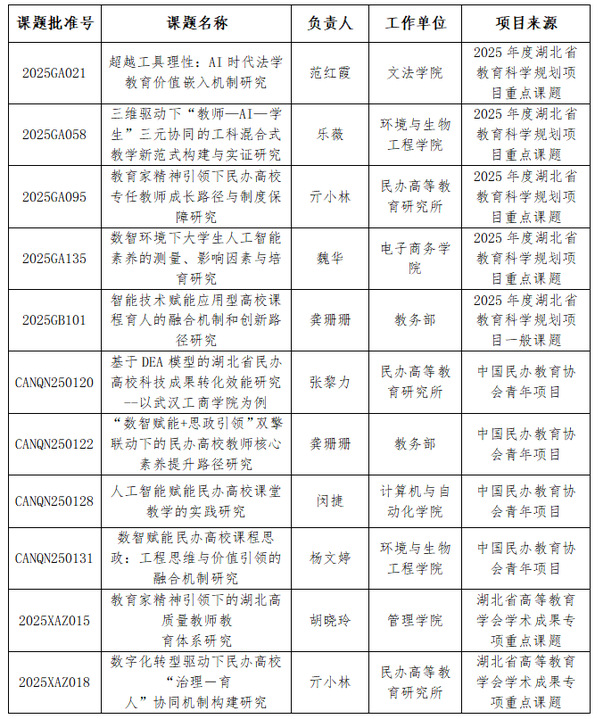 其中,在2025年度湖北省教育科学规划课题立项中,学校共有5项课题获准立项,包括4项重点项目和1项一般项目,立项数量居湖北省同类高校前列。同时,学校还成功获批中国民办教育协会规划青年课题4项,湖北省高等教育学会教育科研重点项目2项,具体立项信息如下: