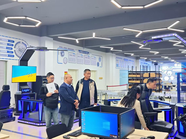 图为董庆喜一行参观智慧物流与供应链仿真实验室