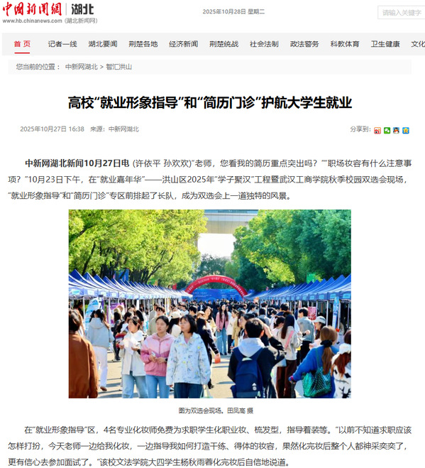 中新网湖北新闻10月27日电 (许依平 孙欢欢)“老师,您看我的简历重点突出吗?”“职场妆容有什么注意事项?”10月23日下午,在“就业嘉年华”——洪山区2025年“学子聚汉”工程暨BB贝博艾弗森官方网站秋季校园双选会现场,“就业形象指导”和“简历门诊”专区前排起了长队,成为双选会上一道独特的风景。