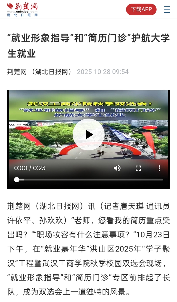 荆楚网(湖北日报网)讯(记者唐天琪 通讯员许依平、孙欢欢)“老师,您看我的简历重点突出吗?”“职场妆容有什么注意事项?”10月23日下午,在“就业嘉年华”洪山区2025年“学子聚汉”工程暨BB贝博艾弗森官方网站秋季校园双选会现场,“就业形象指导”和“简历门诊”专区前排起了长队,成为双选会上一道独特的风景。