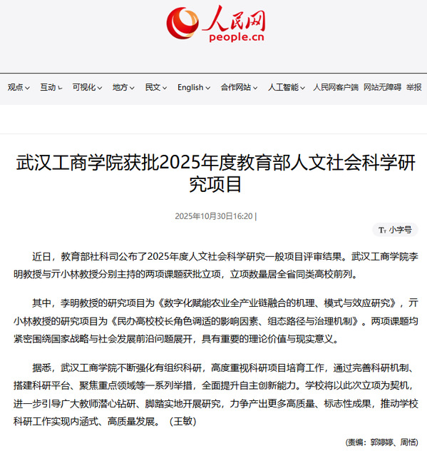 其中,李明教授的研究项目为《数字化赋能农业全产业链融合的机理、模式与效应研究》,亓小林教授的研究项目为《民办高校校长角色调适的影响因素、组态路径与治理机制》。两项课题均紧密围绕国家战略与社会发展前沿问题展开,具有重要的理论价值与现实意义。