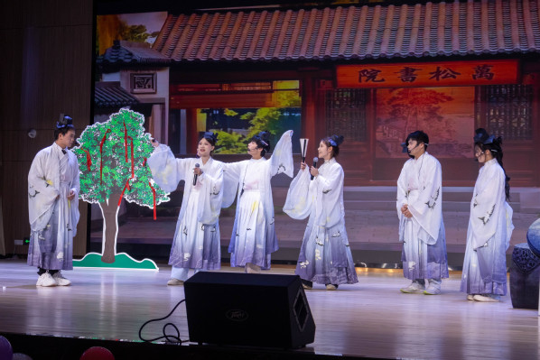 值得一提的是,在本届晚会中,来自文法学院2025级法学专业的学生王博瑞的表现也尤为亮眼,他同时肩负主持人、歌手大赛选手和话剧演员三种角色,其演绎的国风歌曲《典狱司》令人印象深刻。王博瑞分享道:“这次多重身份的体验,让我深刻体会到台前幕后所有工作人员的辛苦和集体凝聚的力量。大家反复排练、精益求精,只为呈现最精彩的时刻!”