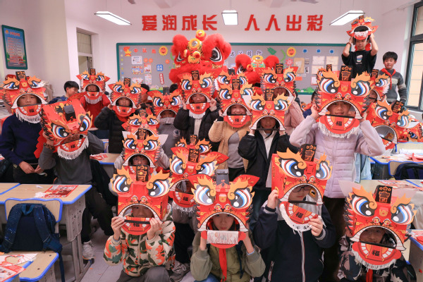 随后的舞狮表演将气氛推向高潮。由4名大学生扮演的两只“狮子”活灵活现,穿梭于课桌之间,孩子们笑声不断,纷纷上前与“狮子”亲密互动,现场气氛热烈。
