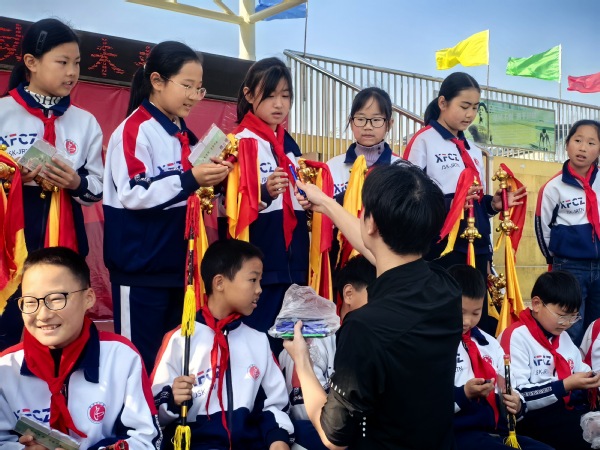 图为学校学生为孩子们赠送礼品