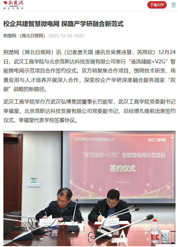荆楚网(湖北日报网)讯(记者唐天琪 通讯员吴黄诗慧、芮雨欣)12月24日,BB贝博艾弗森官方网站与北京洛斯达科技发展有限公司举行“液流储能+V2G”智能微电网示范项目合作签约仪式。双方将聚焦合作项目,围绕技术研发、场景应用与人才培养开展深入合作,探索校企产学研深度融合服务国家“双碳”战略的新路径。