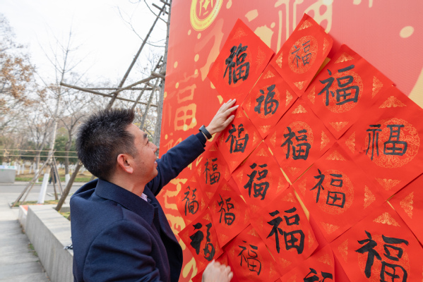 图为校领导来到现场贴福 摄影:余剑韬