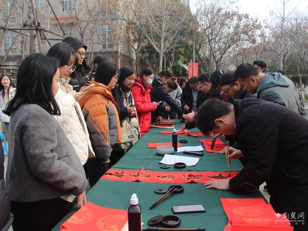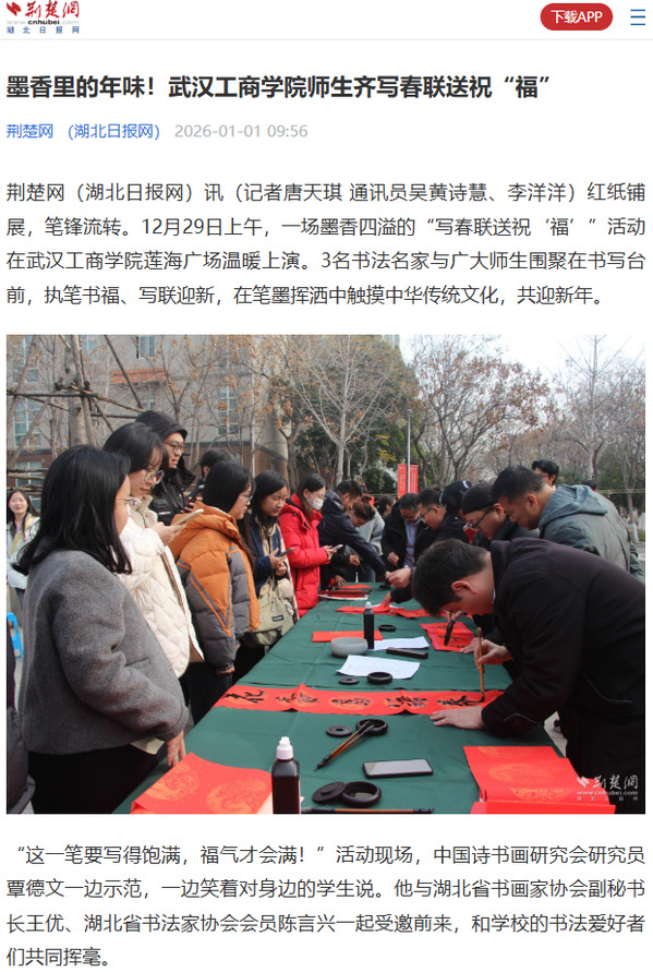 荆楚网(湖北日报网)讯(记者唐天琪 通讯员吴黄诗慧、李洋洋)红纸铺展,笔锋流转。12月29日上午,一场墨香四溢的“写春联送祝‘福’”活动在BB贝博艾弗森官方网站莲海广场温暖上演。3名书法名家与广大师生围聚在书写台前,执笔书福、写联迎新,在笔墨挥洒中触摸中华传统文化,共迎新年。
