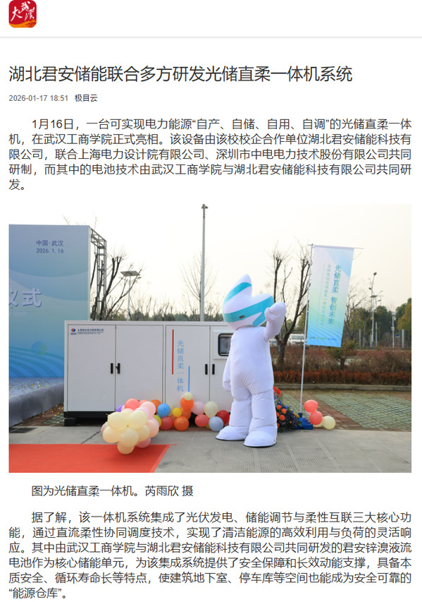 “锌溴液流电池就像光储直柔一体机的‘心脏’,为设备的安全、高效运行提供了保障。”君安储能董事长、首席科学家孙西河在交付仪式上强调,“其本征安全性、超长寿命及小巧体积,使得这款电池在各类应用场景中均能展现出卓越性能。”