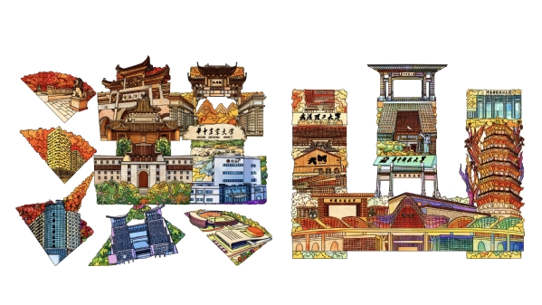 作为主创学生,钟佳敏在分享创作感想时表示,她和徐郑冰老师在历时半个月的创作中,着力将洪山那些“熟悉的地方、学校、企业都揉到画里”,让观者一见即生共鸣。她特别提到,作品中融入的华中农业大学校门、华中师范大学主楼等高校建筑,“不只是房子,更是一代代学子的青春记忆”;而马应龙、烽火创新谷等企业与园区,则代表着洪山产业发展的缩影与活力;武汉火车站、卓刀泉寺等新旧地标并列,则隐喻着洪山“既守着根,又往前冲”的发展姿态。她希望通过这组作品,“让不管是住在洪山的,还是在洪山上学、上班的人,都能找到共鸣,知道这些地方共同构成了我们生活的这片热土。”