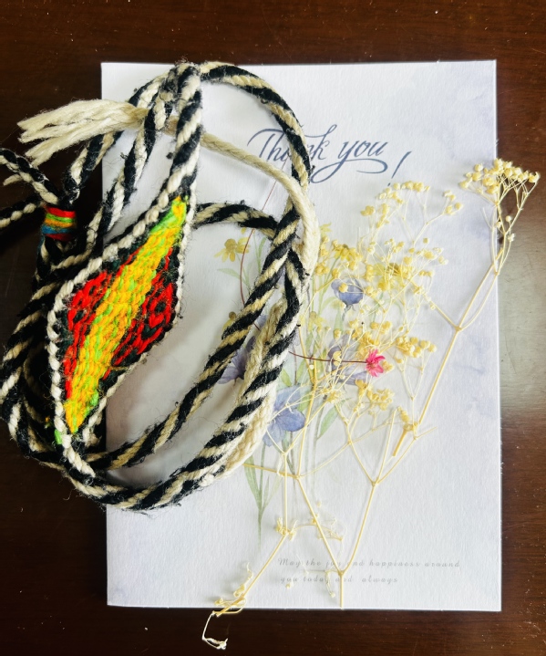 2022年毕业季,小卓离校前来到办公室,将精心制作的贺卡和一条一直戴在手上、已经有些磨损的手工编织彩色手绳郑重地送给肖隽。他沉声说:“这是我出生时奶奶为我编的,她说能保佑平安。我戴了它十几年……现在,我想送给您。”