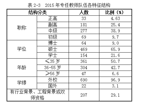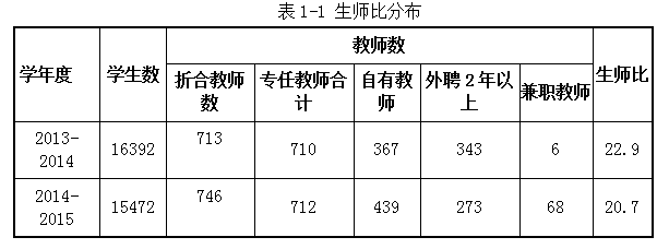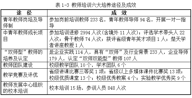 一、“十二五”师资队伍建设工作回顾  学校大力实施“人才强校”战略,坚持引进、培养、使用相结合,以提高师资队伍综合素质为主线,以提升教师能力水平为核心,以培养中青年教师为重点,以优化人才发展环境为保障,提升师资队伍整体水平。  (一)教师队伍满足需要,教师结构日趋合理  通过大力引进、培养和适度外聘等方式,为人才提供有吸引力的薪酬待遇,采取配套科研经费和住房等措施,努力建设一支师德优良、规模适宜、结构合理、水平较高的教师队伍。教师数量、结构能满足应用型人才培养需要。  1.增加专任教师数量,生师比满足要求  现有专任教师712人,兼职教师68人,折合教师746人,生师比20.7:1(见表1-1),达到国家办学条件要求。    各专业的教师数量满足本专业教学需要;学校通过合理控制班级规模,提高课堂教学质量,公共数学采用分级教学,外语或实验课在40人以内,专业课控制在2个教学班以内;实施本科生导师制,每年安排近200名教师承担本科生导师工作,参与学生的学习辅导。  2.采取多种有效措施,教师结构日趋合理  加大博士学历教师和有实践经验教师的引进力度,实施教师分类管理、赴企业实践等措施,教师队伍的年龄、学历、专业技术职务等结构不断改善(详见表1-2)。   专任教师中具备行业(专业)职业资格和任职经历的教师为207人,占29.1%。符合岗位资格的教师占在编主讲教师比例为97.9%。  出台《师德师风建设工作实施办法》、《学术道德规范》等制度,加强师德教育与师风建设,教师从严执教,为人师表,严谨治学,能满足人才培养目标的要求。  1.构建师德长效机制,为人师表蔚然成风   一是加强师德师风的培养教育,倡导“爱与责任”,将师德师风作为新教师岗前培训的必修课程。二是邀请国家级教学名师等进行师德讲座;三是坚持师德考核,从职业道德、敬业精神、教书育人等方面综合考评,职称评审、年度考核实施师德“一票否决制”。十二五期间,30人获省市级及以上思政、德育等奖励;评选出“我最喜爱的教师”19人,“三育人”代表21人;从严处理教学事故38起;未出现违反学术道德规范的事件。  教师围绕应用型人才培养积极开展教研教改,将教研成果应用于教学,效果良好,教师参加教学竞赛获省级以上奖励15项,其中获外研社全国大学英语教学之星比赛三等奖1项,湖北省青年教师讲课比赛三等奖1项;实践指导总体符合学校应用型人才培养需要,如“三学期制”教学改革在文法学院的推广应用,取得扎实成效。学生整体满意,对教师课堂教学质量评价的优良率平均达94.5%。  (三)重视教师培养提高,整体素质稳步上升  以满足教师的个性化需求为出发点,以促进教师的专业发展为落脚点,形成了颇具特色、初见成效的教师培养培训体系。  1.构建培训体系,完善管理制度  (1)成立教师发展中心  2015年成立教师发展中心,以满足教师职业发展需求为导向,用多元化、国际化、复合型、实践型、实用性的知识结构打造教师教育发展平台,实现“提升、融合、评价、研究”四项功能。  (2)健全教师管理制度  出台《新进教师考核管理办法》、《师德师风建设工作实施办法》、《教学团队建设与管理办法》、《培训管理办法》、《教师实践能力培养办法》等制度,明确教师职责,强化教师教书育人的责任感,加强团队建设和人才梯队建设,提升教师教学、科研和实践能力。  (3)构建立体化教师培训体系  以教师的岗位培训和学历学位教育为中心,以教师个人职业发展规划为指引,提出“四化”的培养方向,即“硕博化、专业化、国际化、双师化”,鼓励教师进一步深造,攻读博士学位,提升教学科研和实践应用能力,拓展国际化视野,促进教师培训系统化、规范化。  2.畅通六大途径,实施校院两级协同和分类指导  (1)精心组织,助力教师快速成长  通过六大培养途径(详见表1-3),大力推进教师的培养培训和提高,十二五期间,用于人才项目和培训的经费达1630.1万元。  (2)实施校院两级协同培养  学校将教师队伍建设工作纳入校院两级年度考核目标,将教师招聘、培训、职称晋升、聘期考核的权限交给二级学院。同时各二级学院通过不同方式加强教师培养,依托校级学术带头人、骨干教师,通过学术团队、教学团队等建设平台,引导教师发展。  (3)开展教师发展分类指导与评价  一是加强青年教师的专业培训,对新进教师加强岗前培训,使之站稳讲台;通过示范课、听课、说课、评课等夯实青年教师教学基础;通过青年教师导师制,帮助青年教师提升教学和科研能力。二是加强对骨干教师的转型培训,包括新思维方式、新教学信息技术、理论前沿及应用型人才如何培养的培训,通过促进骨干教师的转型来带动人才培养的转型。  实施教师岗位分类管理。设置教学为主型、教学科研并重型、科研为主型三种岗位,教师在教学、教研、科研方面的聘期任务各有侧重,并有明确的发展目标。教师根据自身特点及岗位要求,选择适合的岗位,促进教师不断成长。  (4)推行“双百”计划,加强“双师型”教师队伍建设  实施“双百计划”,一是安排百名教师到企业实践,参与企业项目、研究企业中的问题,有效将教学内容与企业实践的结合,培养教师实践认知和实践操作能力;二是聘请百名企业高级管理和工程技术人员来校担任企业导师,指导本科生