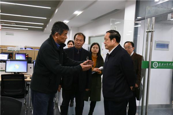 随后,刘传铁厅长一行来到校实验教学中心,参观了经管实验教学中心和环生实验教学中心两个湖北省重点建设实验教学示范中心的部分实验室,并向经管实验教学中心负责人、实验中心副主任毛志山教授和环生实验教学中心负责人、环生学院常务副院长吴士筠了解两个中心的建设情况。在环生实验教学中心实验室,刘传铁厅长问道:“实验室条件如何?学生可以在这里做实验吗?学生的培养质量怎么样?”吴士筠介绍,这个实验室设备先进,有的设备价值在百万以上,实验室除了为企业开展技术培训外,还为学生提供了实习实践的场所,提升了学生的科研能力和实践能力,环生学院的人才培养质量较高,有的毕业生短期内就担任了企业的技术骨干、副厂长,学院学生的考研成功率也很高。在得知两位负责人都是从公办院校请来的资深专家时,离开实验教学中心前,刘厅长对他们表示感谢:“谢谢你们支持民办院校的发展!”