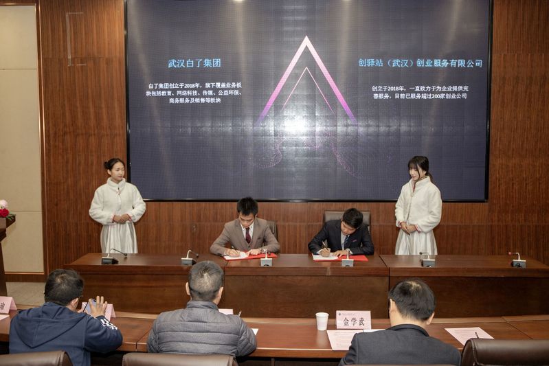 最后,在发布会现场,武汉白了集团董事长陈小雨也和创驿站(武汉)创业服务有限公司董事长江闯达成了合作,并签署了战略合作协议。
