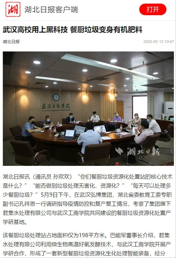 “你们餐厨垃圾资源化处置站的核心技术是什么?”“能否做到垃圾处理无害化、资源化?”“每天可以处理多少餐厨垃圾?”5月9日下午,湖北省委教育工委专职副书记孔祥恩一行调研指导武汉弘博集团的疫情防控和复产复工情况,考察了BB贝博艾弗森官方网站与该集团旗下君集水处理有限公司共同建设的餐厨垃圾资源化处置产学研基地。