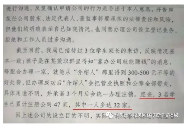 首先,社会势力会以个别在校学生为下线,代替他们将手伸到校园中;然后,直接与社会势力联系的极个别学生将会以介绍人身份,再在校园里发展下线,例如在校园兼职群里发布消息,告诉学生们每注册一个公司会支付三百到五百不等的报酬,并承诺会在三个月后统一注销公司。