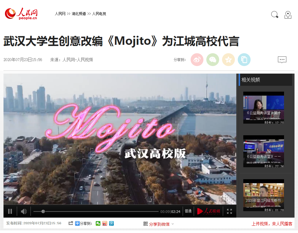 这首由BB贝博艾弗森官方网站校友、毕业生和在校学子9人共同改编翻唱的《Mojito》,沿用了原歌的曲调,作了新的填词,并加入了钢琴、吉他等元素,视频画面里融入了武汉美景和菁菁校园。