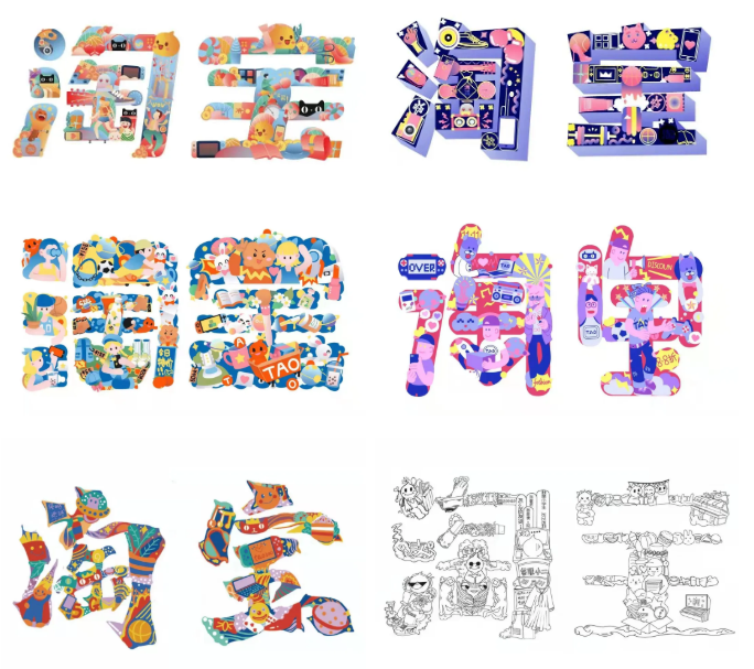 截稿到9月12日,历时35天,最终每个人都顺利完成了2-3张的“淘宝”字绘作品,作品以“淘宝”两个汉字结构作为主视觉,以绘画的形式完美融入了受众喜闻乐见的购物车、打折促销、商品信息、快递员等淘宝元素,表现出淘宝年轻又有趣的魅力,同时又能适用于不同的应用场景。