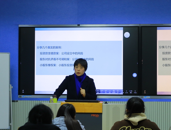 在分享案例之前,李巧玲副教授介绍了公司设立中、治理中以及小股东投资等方面的法律风险。她指出,在创业过程中,避免法律风险是非常重要的。接着,她为同学们详细讲解了如何对公司设立风险、小股东投资风险、大股东投资风险以及公司章程存在的风险进行防范。