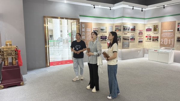 图为档案馆人员陪同参观校史馆 摄影:杨蕊嘉